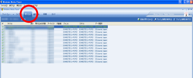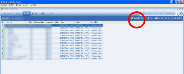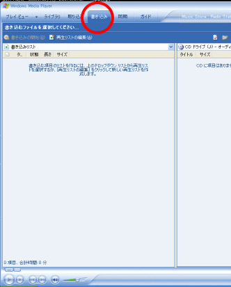 1.音楽CDをドライブにセットし、メディアプレイヤーを立ち上げ↓の印の部分
