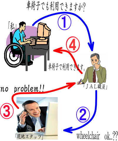 現地に行くと言語が違うため聞けることは事前にここで聞いておいたほうがよい。車椅子の場合普段では、普段健常者では聞かない細かな質問にも答えていただけました。