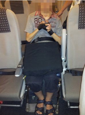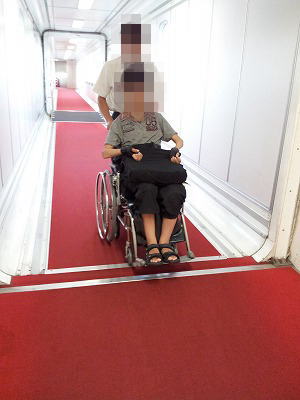 7:15 飛行機に搭乗 搭乗待合室で搭乗用の幅の狭い車椅子に乗り換え、連絡通路を通り機内へ向かい、機内へ乗り込みます。(成田空港まで、自分の車椅子は貨物室へ)。