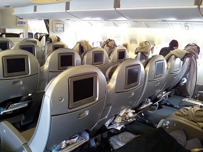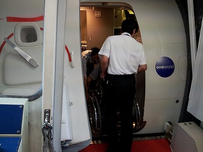 国内線と同じで幅の狭い車椅子に乗り換え、席へ移動。自分の車椅子は預け荷物と同じ貨物室に持っていかれます。