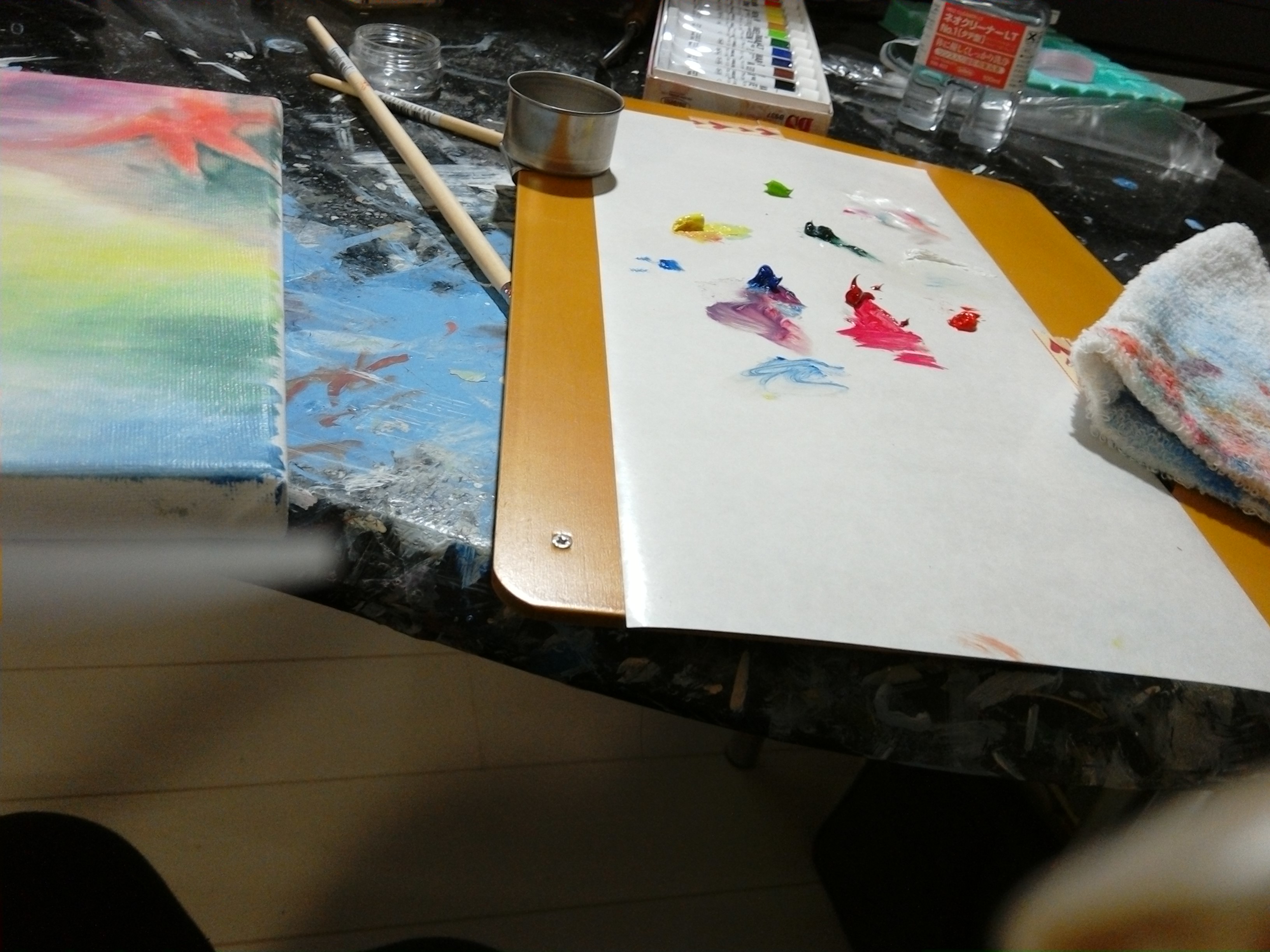 このキャンバスはいくら絵の具を乾かしても、にじんだり色落ちし、刷毛で塗るニスでは失敗したので、今回はじめてスプレーニスを使用した。