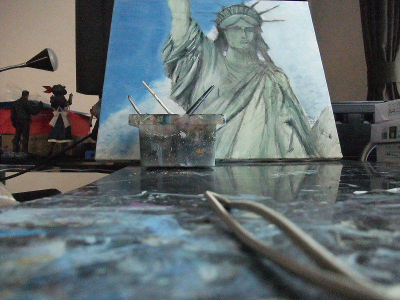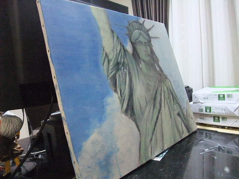 背景色を写真を真似て、暗い水色で一度塗ったが像と同系色になりインパクトも何もない絵になった。