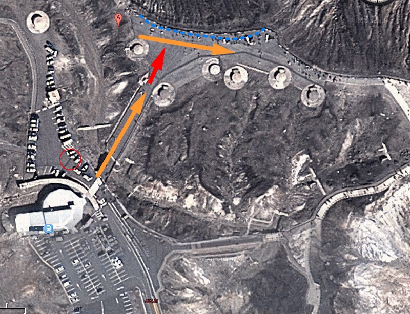 ガスが酷く火口への坂が急だったので坂の手前で写真を撮って帰ろうとしたが、嫁様が青い点線のスポットまで車椅子を合わせた重さ65kgの私を、斜めに蛇行し、押して駆け上がったがやはり非常にきついので、2人以上の介助者が居ないとおすすめしません。