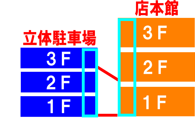 2F駐車場に車を止めると、エレベーターで1Fか3Fへ移動して、本館へ渡ります。